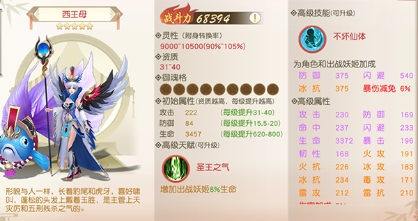 西王母作为最强妖姬之一,其属性自然也非常之高。初始战斗力就达到了:68394,灵性(附身转换率):9000~10500(90%-105%),资质31~40,御魂格有九格。